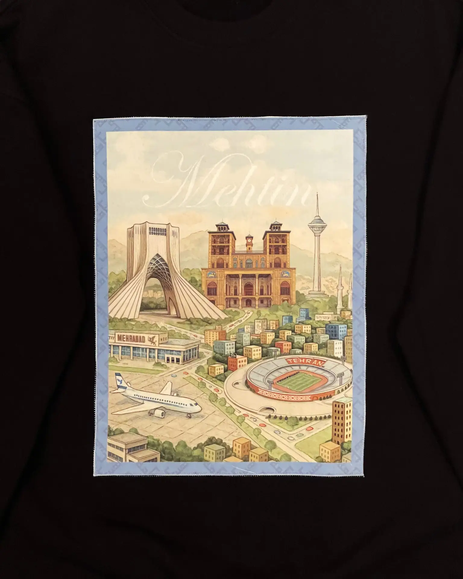 - چاپ از طرحی از نمادهای قدیم و جدید طهران در کنار هم که روی لباس دوخته شده